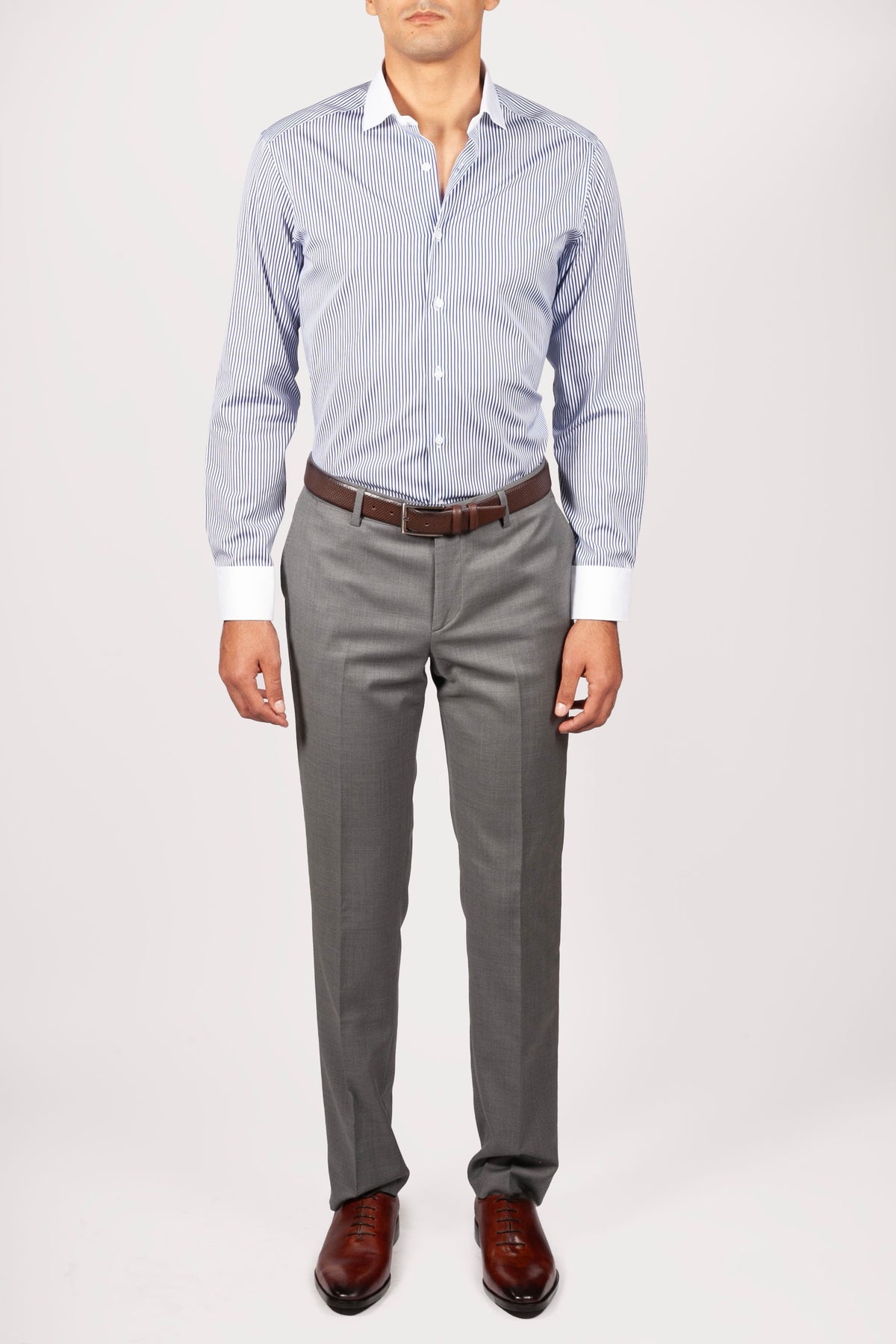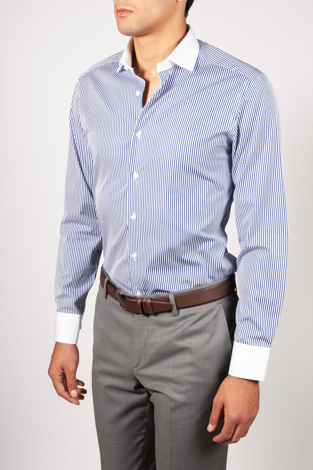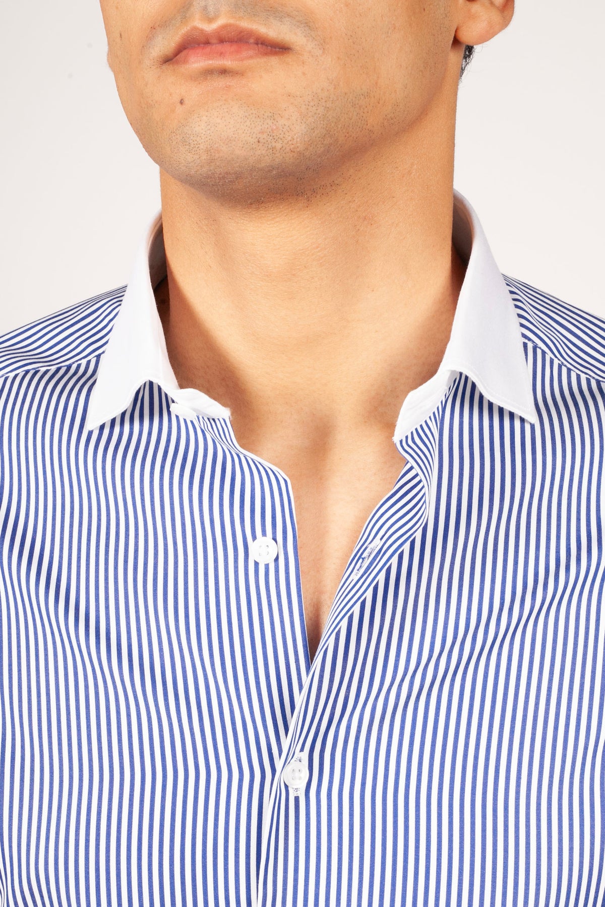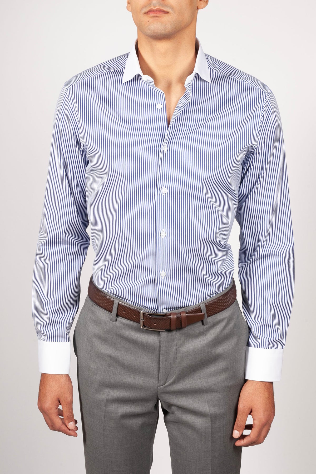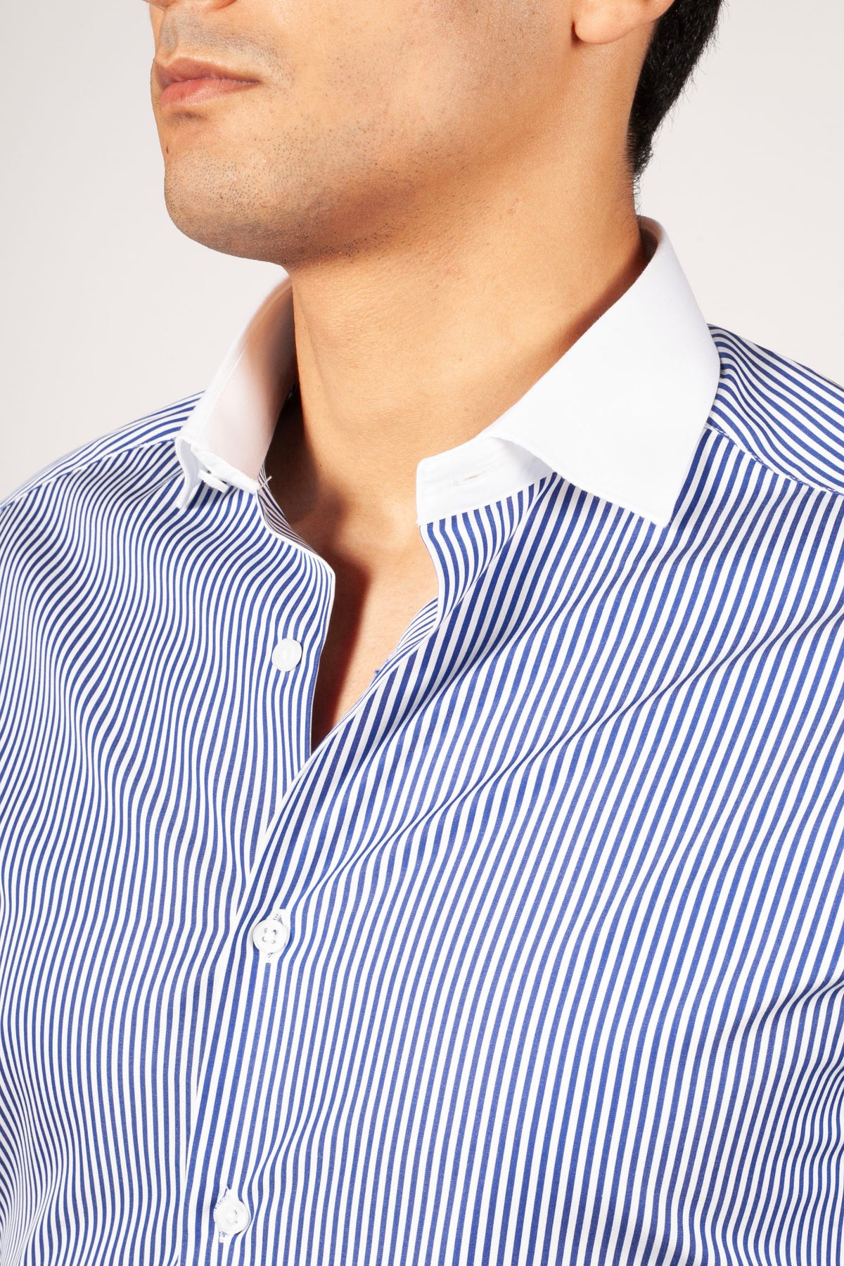cette chemise blanche a rayures bleu i est conçu dans un coton double retour particulièrement doux, une chemise parfaite pour les saisons froides, légère et agréable à porter. Sa rayure à effet torsade est un grand classique du vestiaire masculin. Elle affiche un style classique et s'associe parfaitement avec les tenues costume classique chic mais aussi avec un jean style casual.