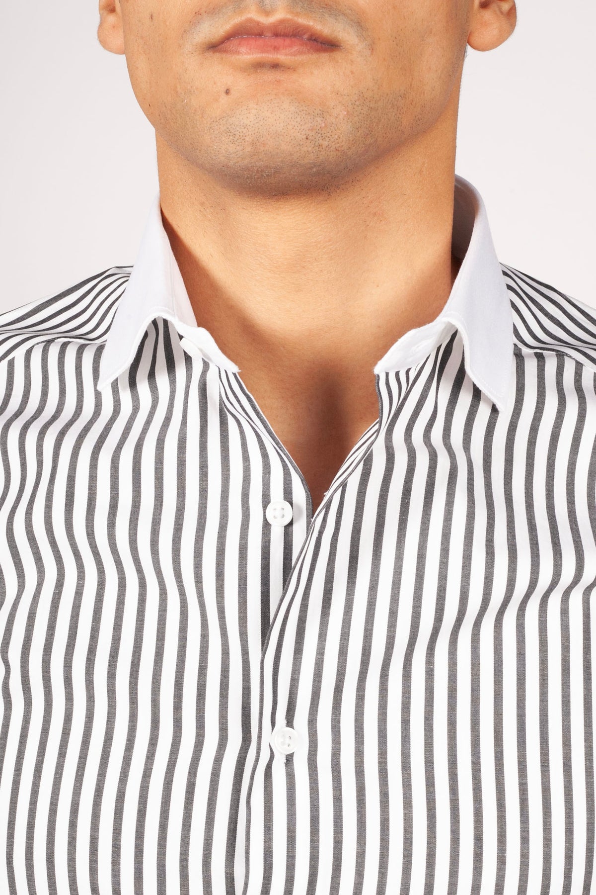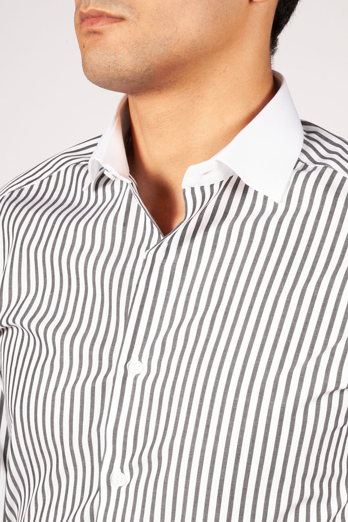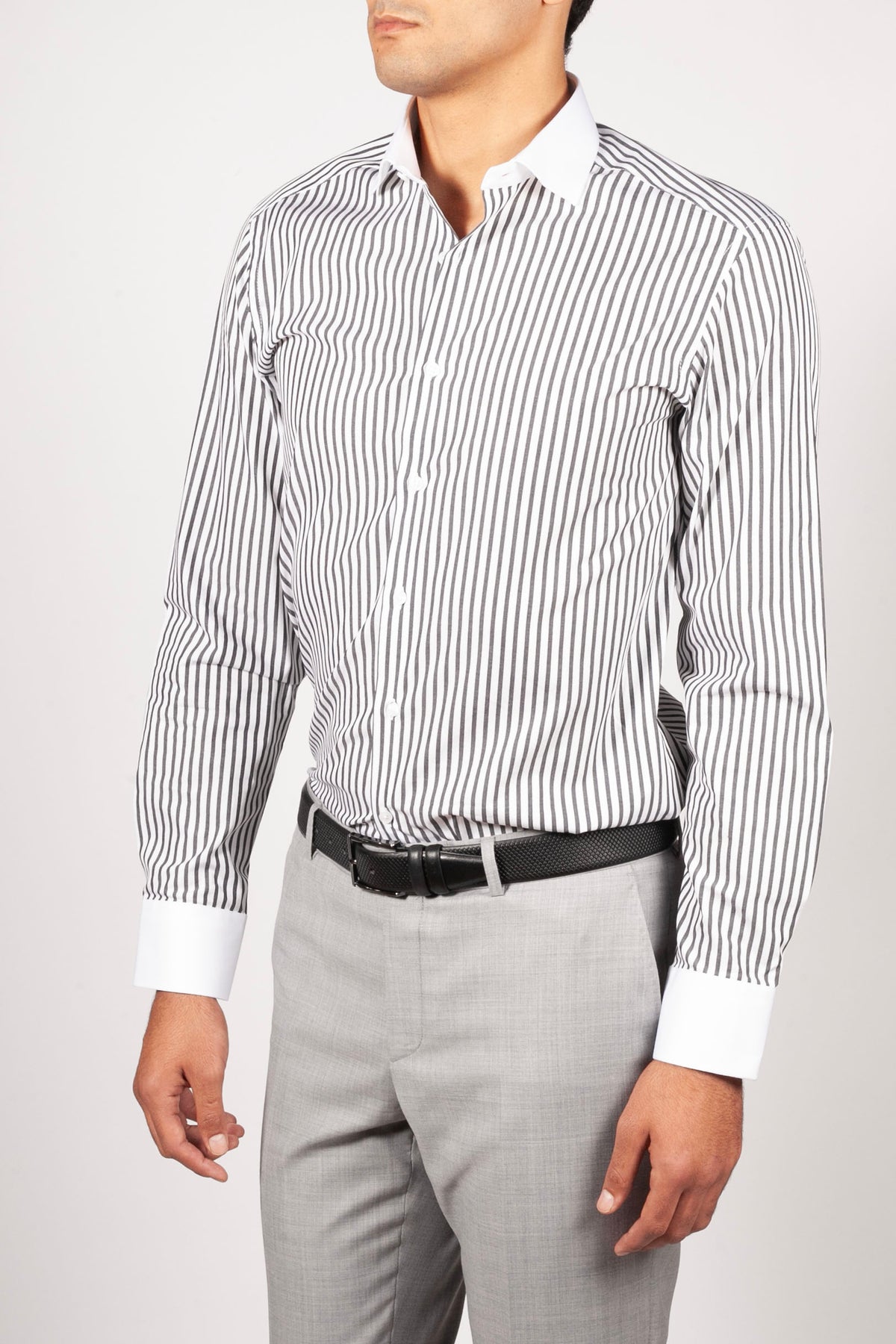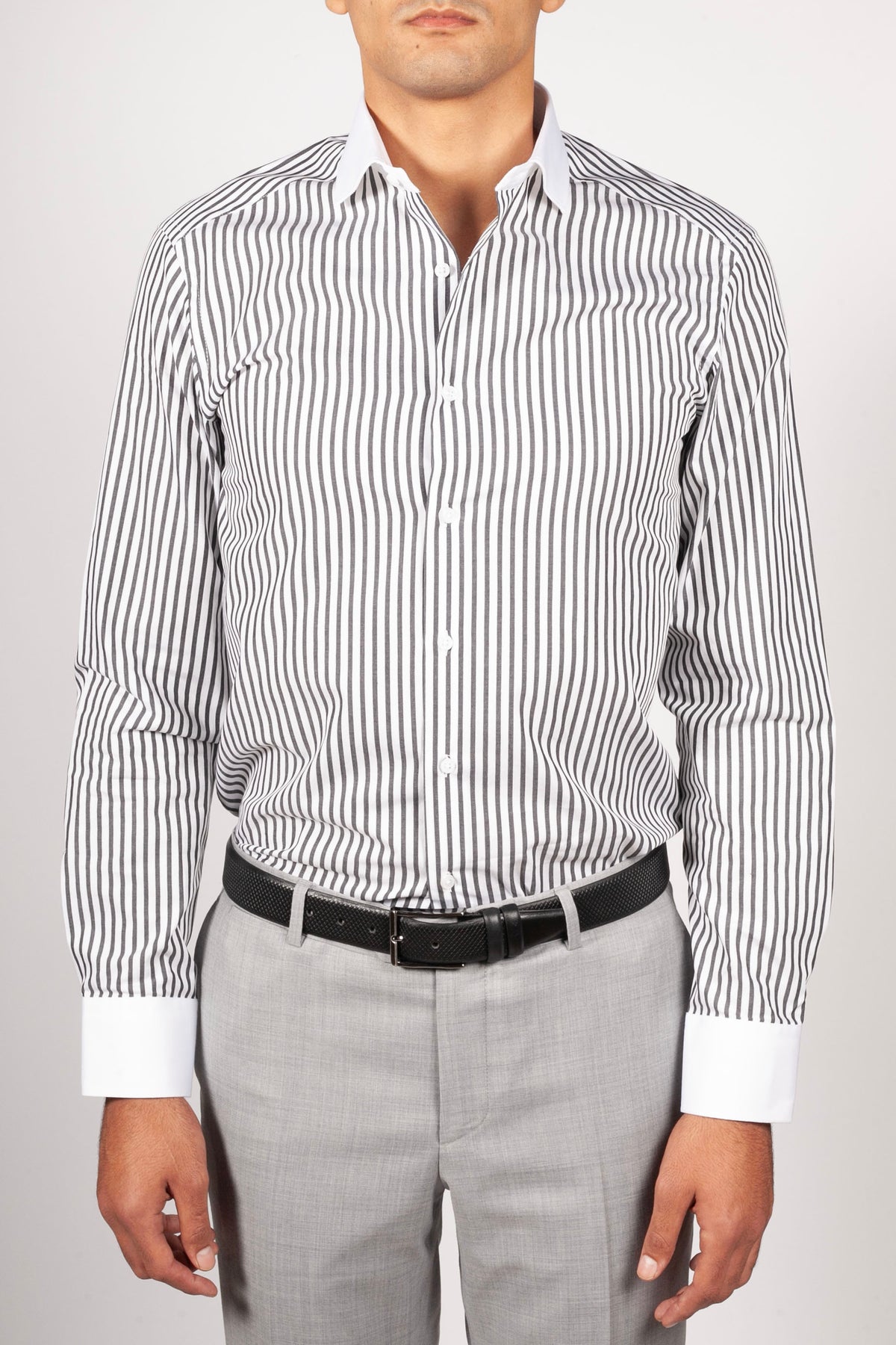 cette chemise blanche a rayures gris-excelsior i est conçu dans un coton double retour particulièrement doux, une chemise parfaite pour les saisons froides, légère et agréable à porter. Sa rayure à effet torsade est un grand classique du vestiaire masculin. Elle affiche un style classique et s'associe parfaitement avec les tenues costume classique chic mais aussi avec un jean style casual.