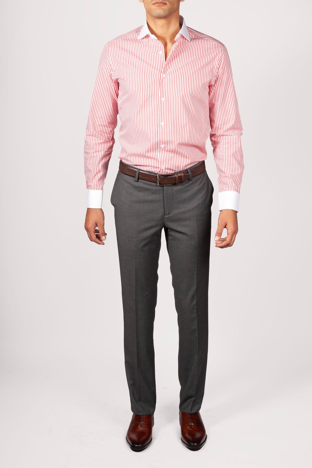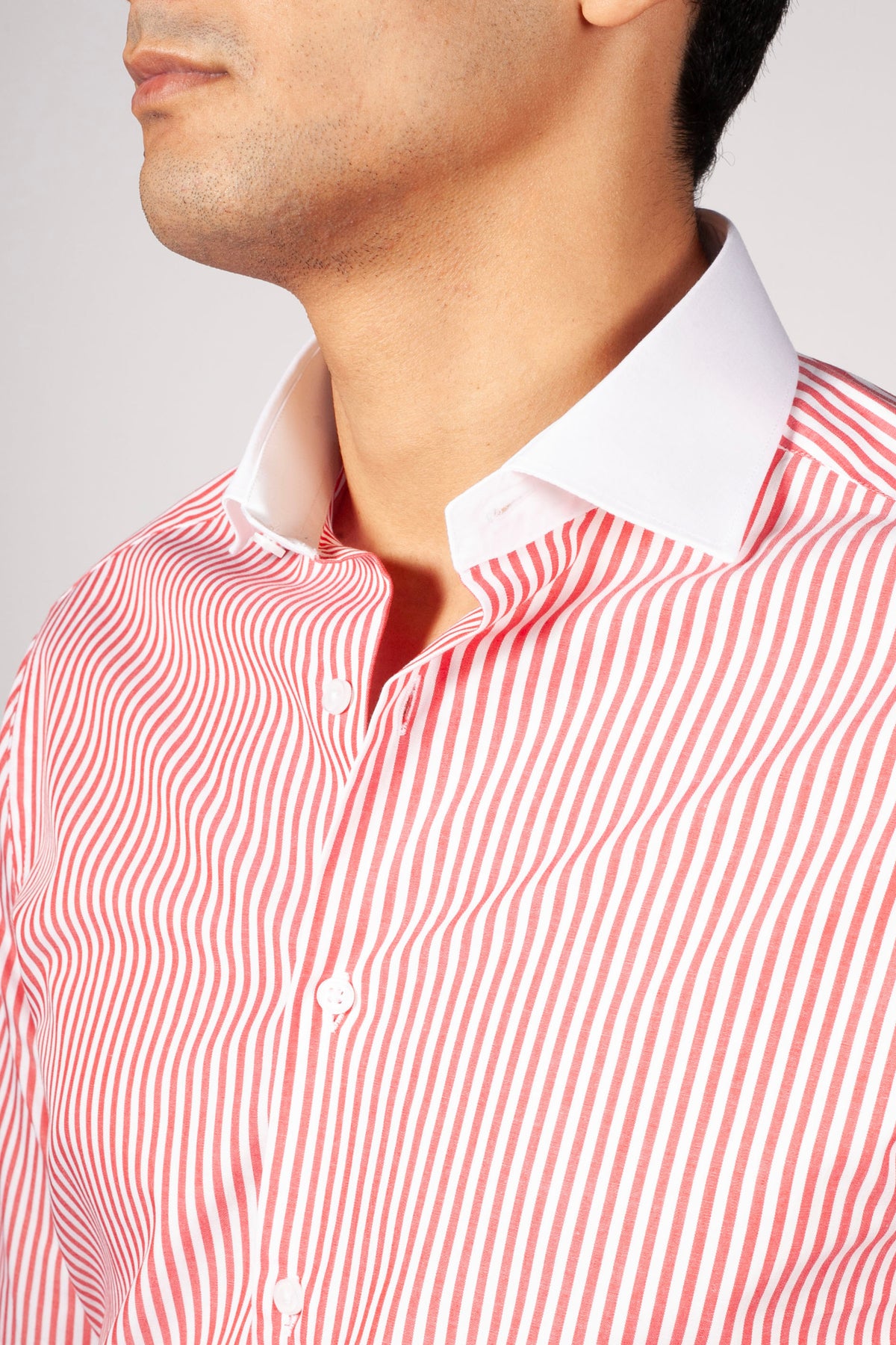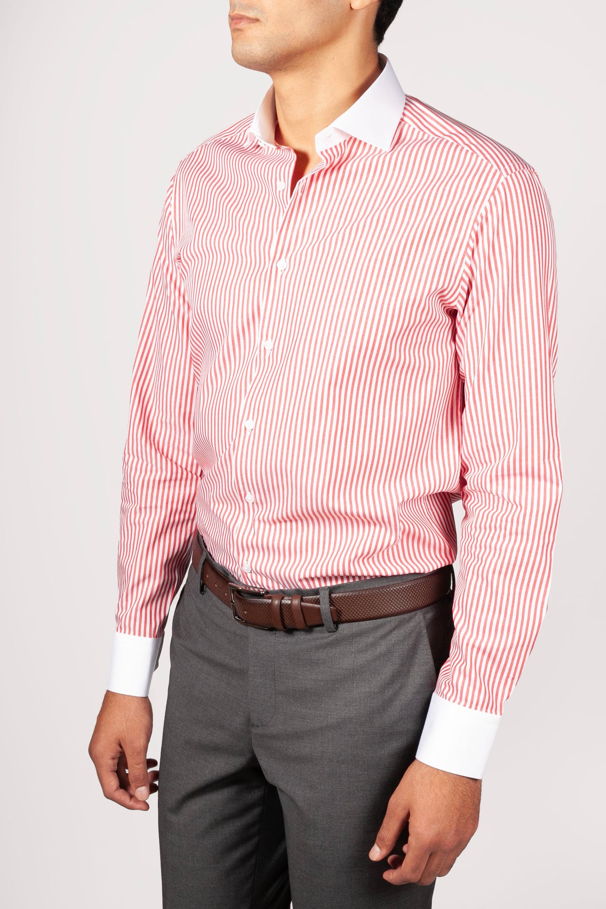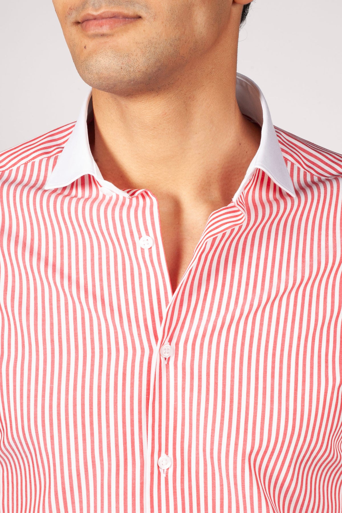 cette chemise blanche a rayures rouge i est conçu dans un coton double retour particulièrement doux, une chemise parfaite pour les saisons froides, légère et agréable à porter. Sa rayure à effet torsade est un grand classique du vestiaire masculin. Elle affiche un style classique et s'associe parfaitement avec les tenues costume classique chic mais aussi avec un jean style casual.